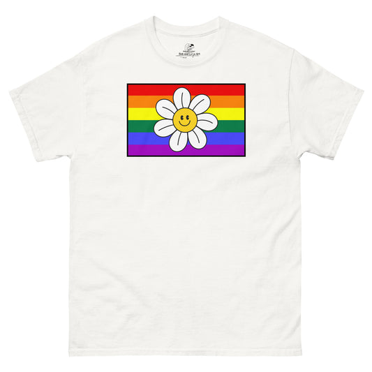 Rainbow Flag & Happy Daisy Gay Pride Unisex Classic Fit Short Sleeve Tee in Black & White