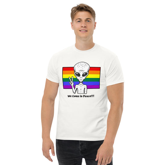 "We Come in Peace" - The Outer Space Ancient Alien & Rainbow Flag Gay Pride Unisex Classic Tee in White