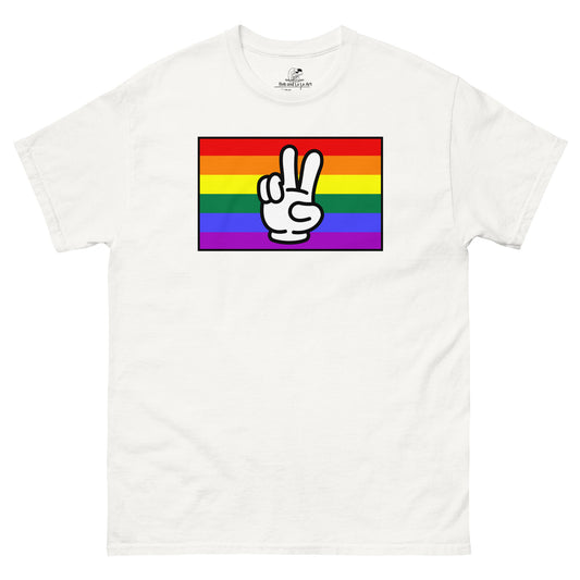 Gay Pride Rainbow Flag with Peace Hand Symbol Unisex Classic Tee in Black & White
