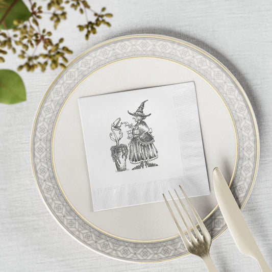 Agnes the Witch & Seymour the Hungry Houseplant Halloween White Coined Napkins