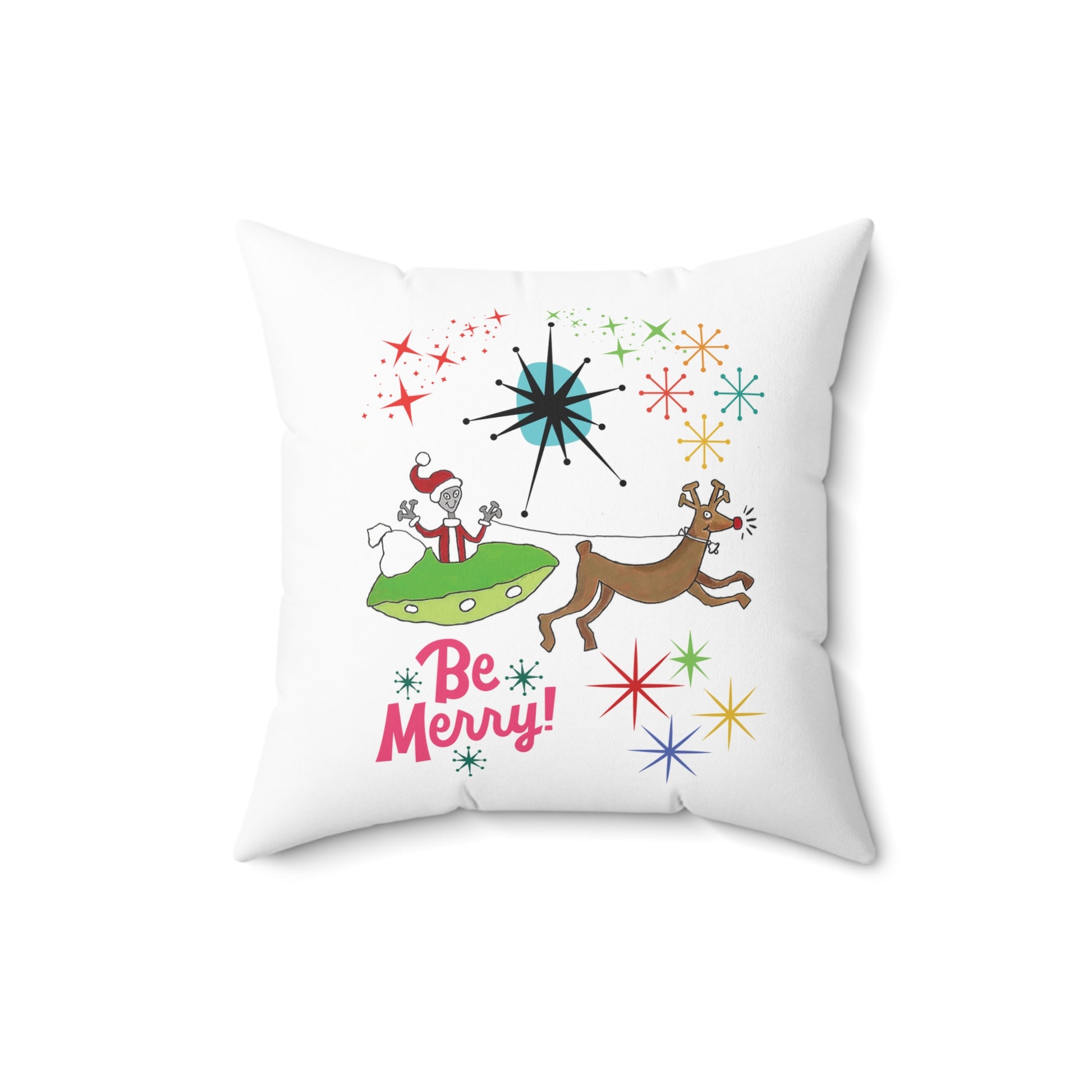 Add a splash of Mid-Century charm and cosmic fun when decorating this Christmas with our Space Alien Santa Claus & Rudolph Accent Pillows!!! With this Santa Claus, your UFO will be out of this world!!!